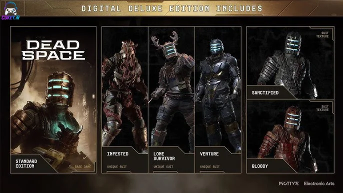 Dead Space Digital Deluxe Edition شامل بازی اصلی به همراه پنج آیتم انحصاری (سه لباس ویژه و دو بافت مخصوص لباس) است. با این نسخه، ظاهر خود را برای مقابله با وحشتهای کشتی فضایی USG Ishimura ارتقا دهید!